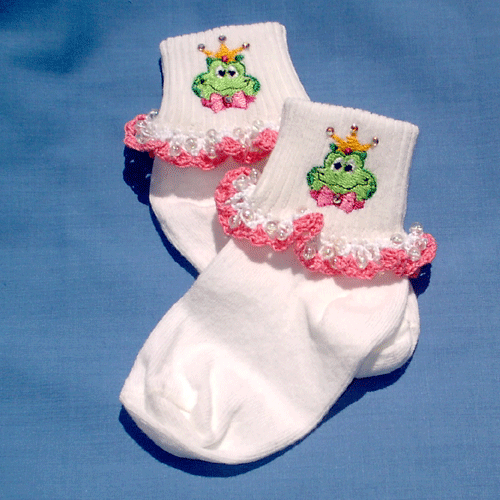 The embroidered frog prince looks very dashing in his golden crown and pink bow tie. Austrian cut crystals sparkle in the sun as the added crown jewels. The crochet lace edging with added beads finish the socks for a complete package!!