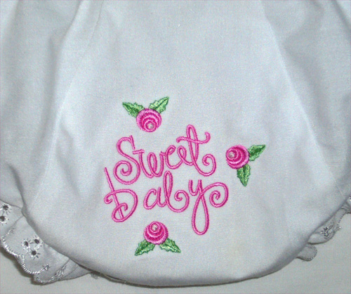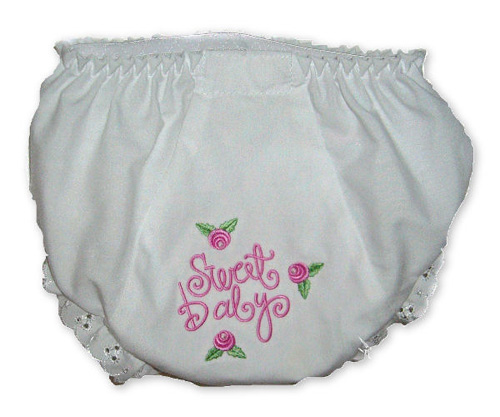 These "baby bloomers" are made of 65% polyester, 35% cotton batiste and have embroidered eyelet edging.